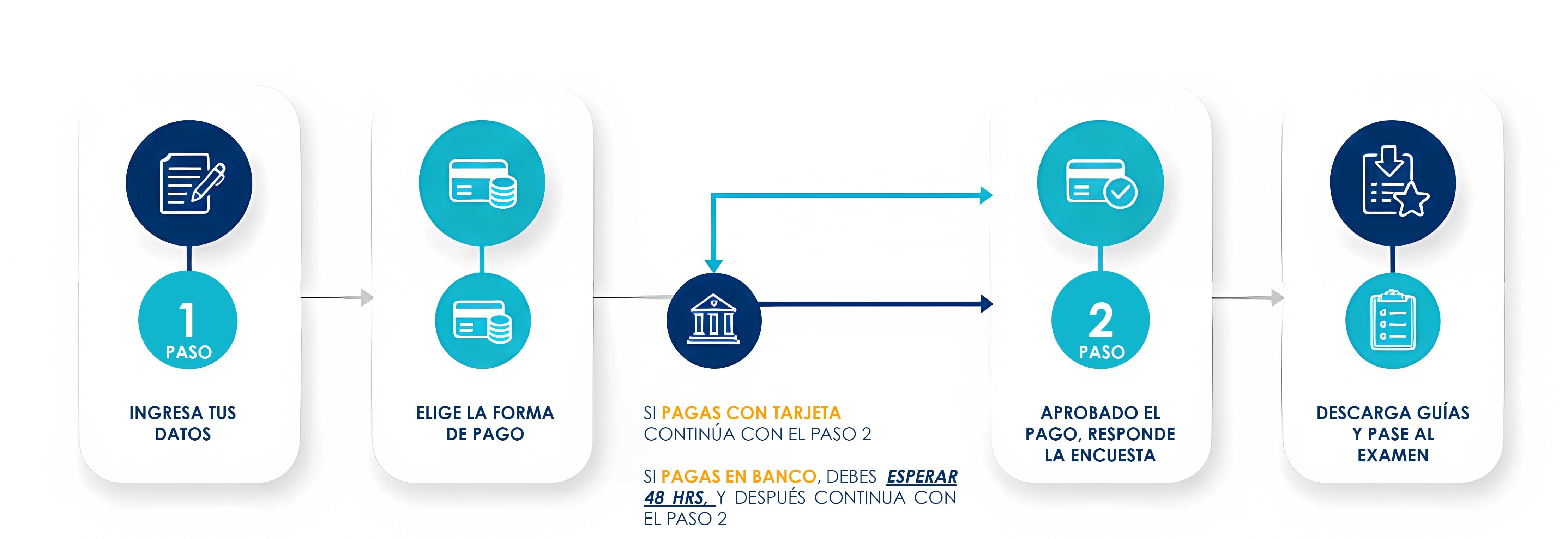 - Pago con tarjeta (no transferencia). Esta opción es recomendable, ya que el pago se refleja de manera inmediata para concluir con la impresión de los pases al examen y descargar las guías de estudios.